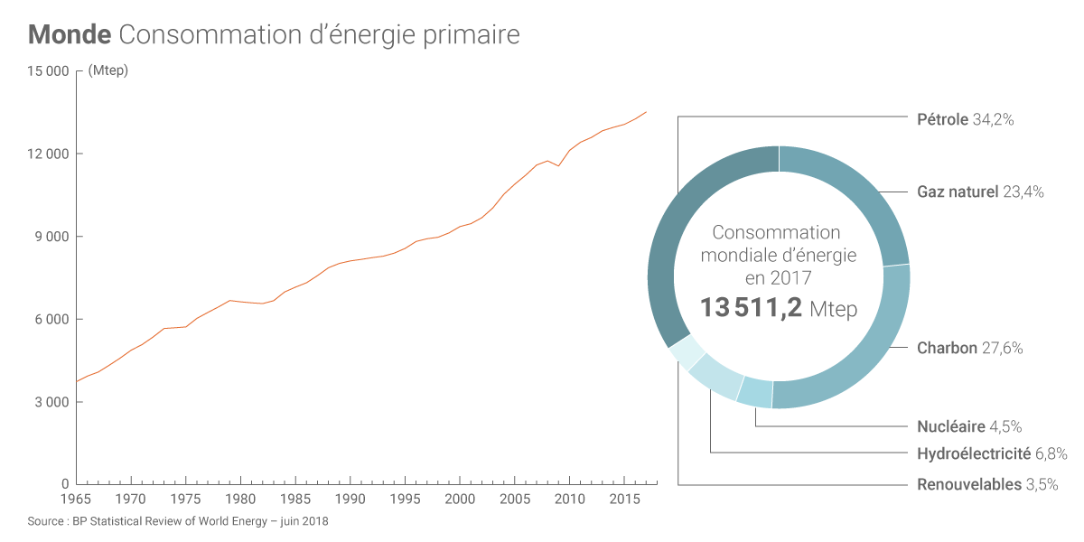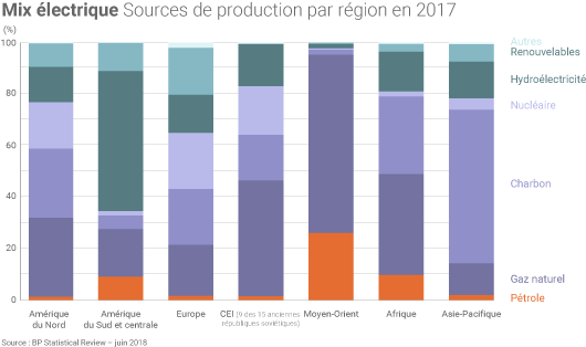 Le développement des énergies renouvelables hors hydroélectricité a été particulièrement important (+ 16,6%) mais celles-ci ne comptaient encore que pour 3,5% de la consommation d’énergie primaire dans le monde en 2017. La part de l’énergie nucléaire reste pour sa part relativement stable (4,4% en 2017).