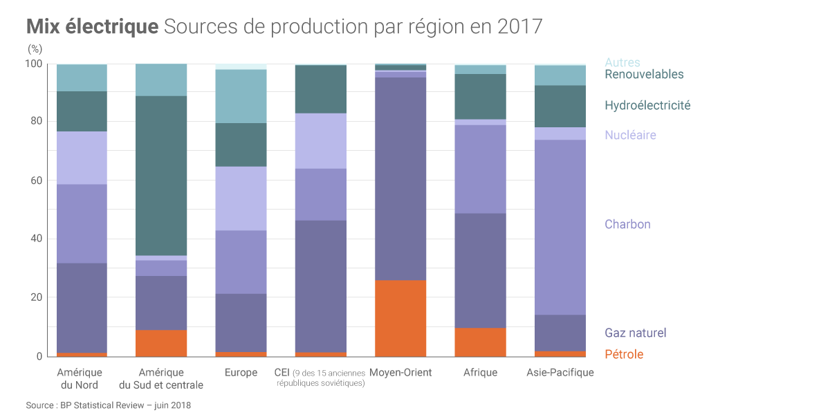 La production mondiale d’électricité dans le monde a augmenté de 2,8% en 2017, la quasi-totalité de cette hausse (94%) provenant des pays émergents tandis que la production dans les pays de l’OCDE est restée « relativement stable depuis 2010 ». Les énergies renouvelables et le charbon ont respectivement compté pour 49% et 44% de la hausse de la production mondiale en 2017.