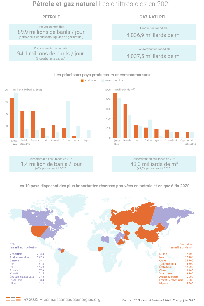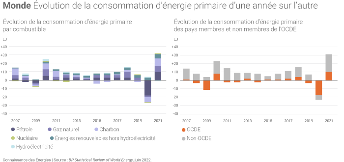 En 2021, la consommation mondiale de pétrole a augmenté de 5,3 millions de barils par jour (Mb/j) par rapport à 2020 mais est restée inférieure de 3,7 Mb/j au niveau de 2019. Cet écart est en très grande partie lié à la baisse de consommation de l’aviation mondiale, particulièrement affectée par la pandémie de Covid-19. La consommation mondiale de gaz naturel a pour sa part augmenté de 5,3% en 2021 par rapport à 2020 (dépassant pour la première fois la barre des 4 000 milliards de m3 consommés) et retrouvé un niveau supérieur à l'avant-Covid-19.