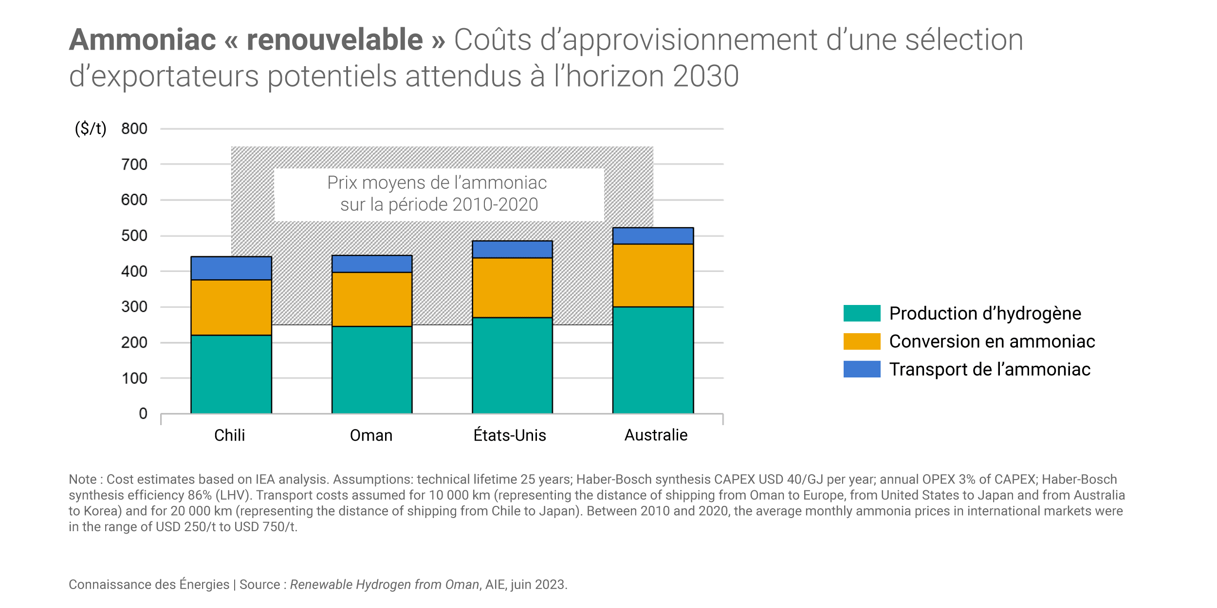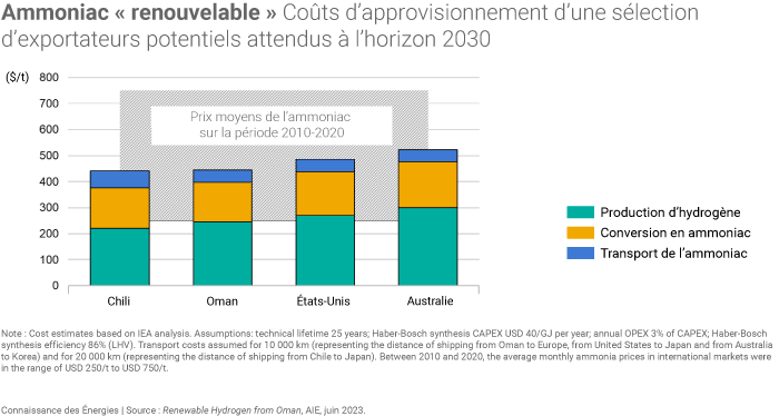Le rapport précise que les futures exportations d'hydrogène renouvelable d'Oman pourraient être acheminées sous forme d'ammoniac, qui « semble être le moyen privilégié pour transporter l'hydrogène par voie maritime ». À cette fin, les infrastructures d'ammoniac devraient être significativement augmentées : Oman exporte actuellement près de 200 000 tonnes d'ammoniac par an et le sultanat pourrait « avoir besoin d'une capacité d'exportation 20 à 30 fois supérieure » d'ici à 2030 si le choix d'exporter l'hydrogène sous forme d'ammoniac se confirme.