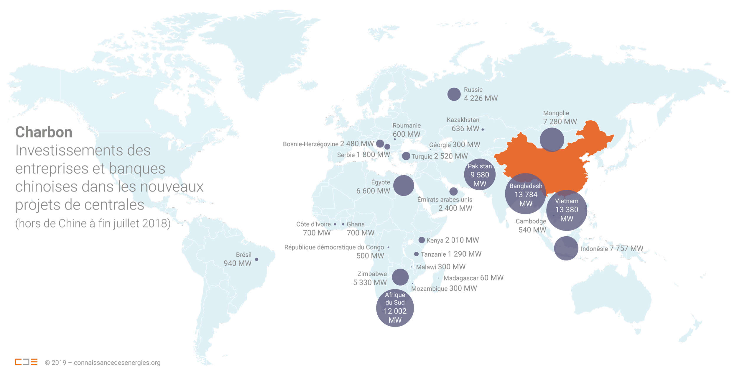 À fin juillet 2018, les investissements en cours ou prévus des banques et entreprises chinoises dans des projets de centrales à charbon hors de Chine s’élevaient à 35,9 milliards de dollars selon les dernières données de l’IEEFA. Au total, ces investissements portaient sur 102 GW de capacités électriques, soit plus du quart des projets de centrales à charbon en cours de développement dans le monde « hors Chine » (d’une puissance cumulée de 399 GW).