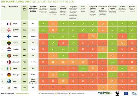 Dans ce rapport réalisé par son bureau des politiques européennes, le WWF (World Wide Fund for nature) présente les résultats du projet MaxiMiseR qui compare les stratégies nationales bas-carbone remises par les différents États membres en 2015 et émet quelques recommandations à ces derniers. Un classement des différentes stratégies nationales est présenté sur la base de multiples critères : niveau d’ambition des objectifs climat-énergie, caractère « réaliste » de la mise en œuvre des stratégies, transparence des procédures, engagement politique, mécanisme de contrôle, etc. La France arrive en première position de ce classement devant le Royaume-Uni et la Finlande.