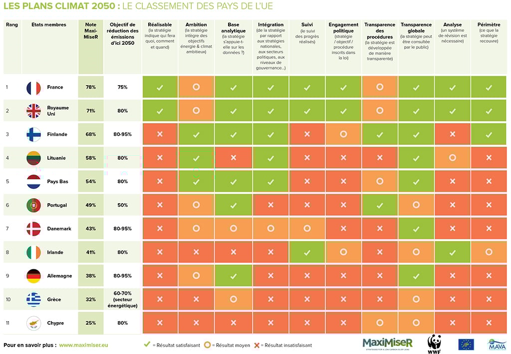 La stratégie nationale bas-carbone de la France, qui est légalement contrainte, est notamment saluée par l’étude pour l’engament politique dont elle a fait l’objet, avec la loi de transition énergétique adoptée à l’été 2015 et les dispositifs associés. Le niveau d’ambition et la transparence des procédures pourraient toutefois être améliorés selon WWF. A l’occasion de la publication de ce rapport, Pascal Canfin, directeur général du WWF France, a par ailleurs souligné « le retard important que la France accuse dans le domaine des énergies renouvelable » par rapport à ses voisins européens(1).