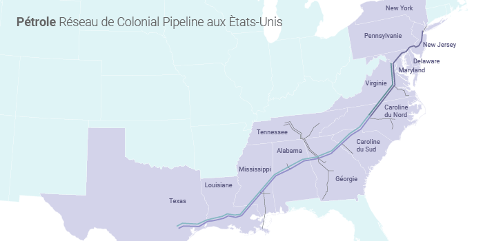 Colonial Pipeline désigne un réseau d’oléoducs d’environ 5 500 miles de long - soit près de 8 850 km - transportant des produits pétroliers (essence, gazole, fioul, kérosène)(1) depuis les raffineries installées sur la côte du Golfe du Mexique jusqu'au nord-est des États-Unis dans la région de New York. Au total, le pipeline traverse 17 États américains, comptant pour presque 40% de la population nationale(2) et environ 30% de la consommation de pétrole des États-Unis.