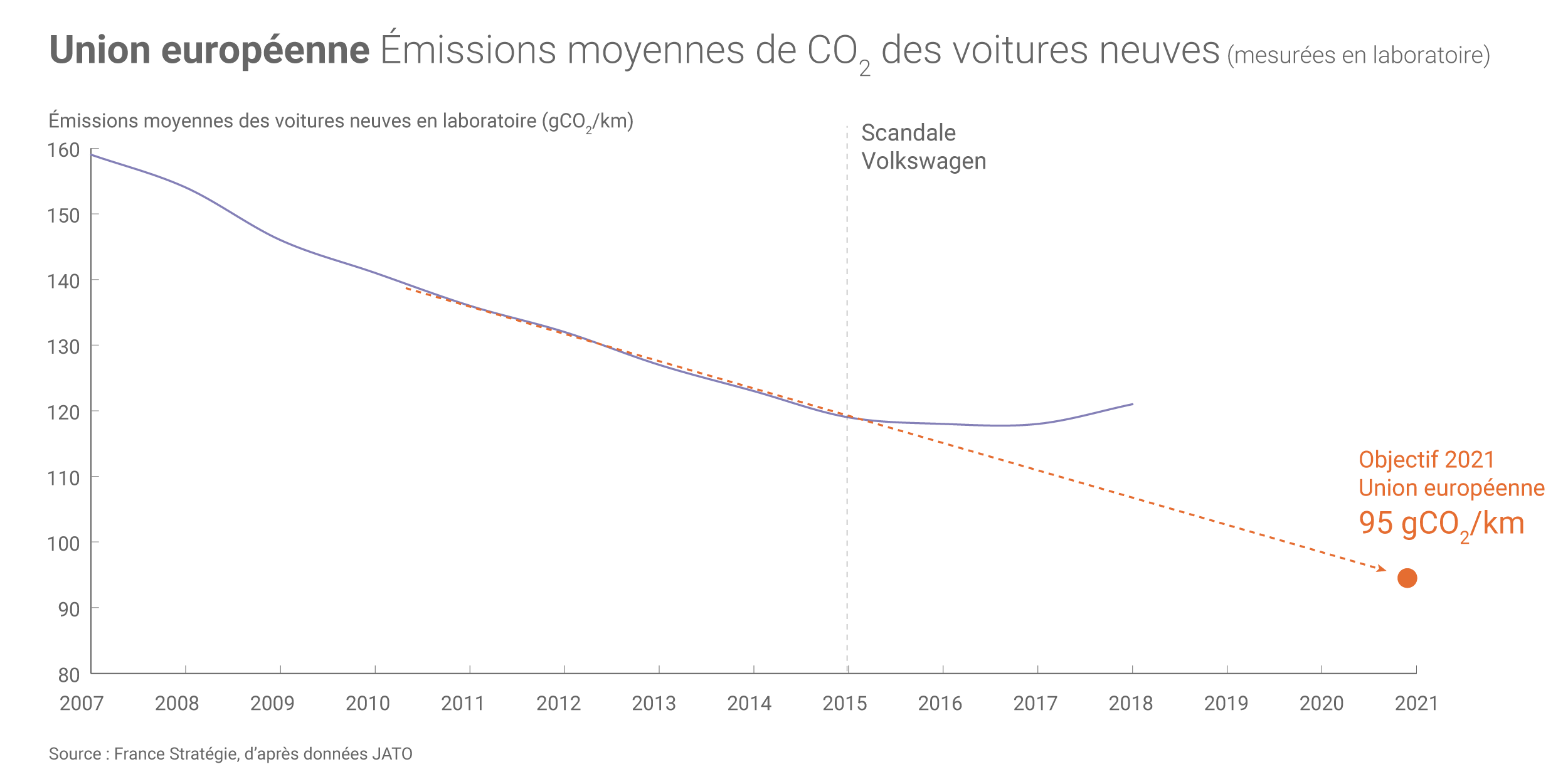 En 2009, l'UE a imposé aux constructeurs automobiles une première limite de 130 g CO2/km pour les voitures neuves en 2015 (objectif atteint « par la plupart d’entre eux avec deux ans d’avance »). Une seconde limite de 95 g CO2/km a été fixée en 2013 pour 2021. (©Connaissance des Énergies, d'après France Stratégie)