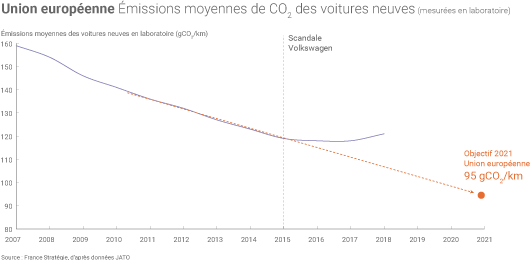 En 2009, l'UE a imposé aux constructeurs automobiles une première limite de 130 g CO2/km pour les voitures neuves en 2015 (objectif atteint « par la plupart d’entre eux avec deux ans d’avance »). Une seconde limite de 95 g CO2/km a été fixée en 2013 pour 2021. (©Connaissance des Énergies, d'après France Stratégie)