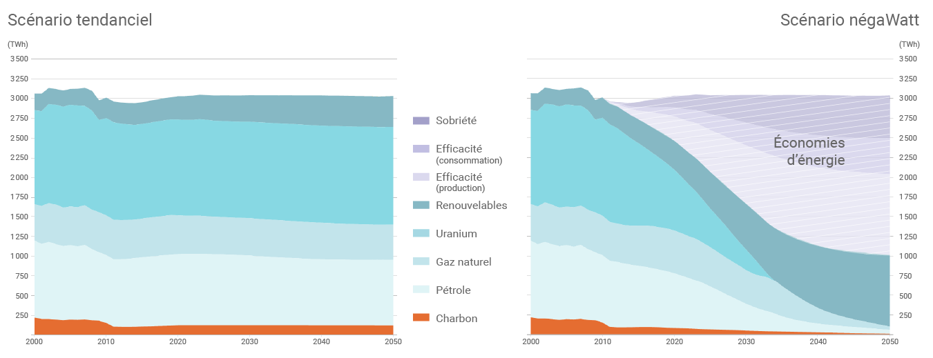 Scénario négaWatt sur l'évolution de la consommation d'énergie primaire en France d'ici à 2050 (©négaWatt)
