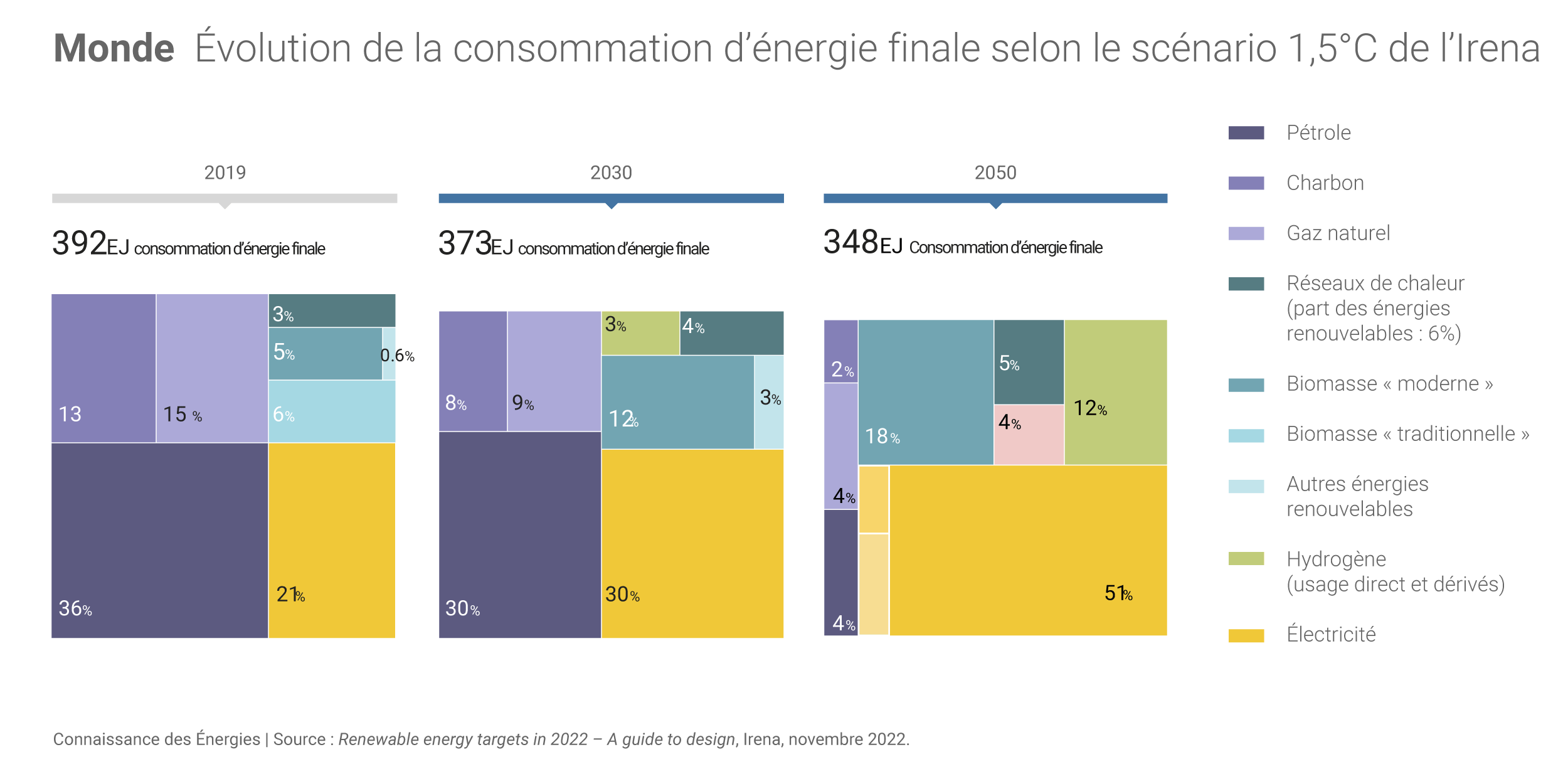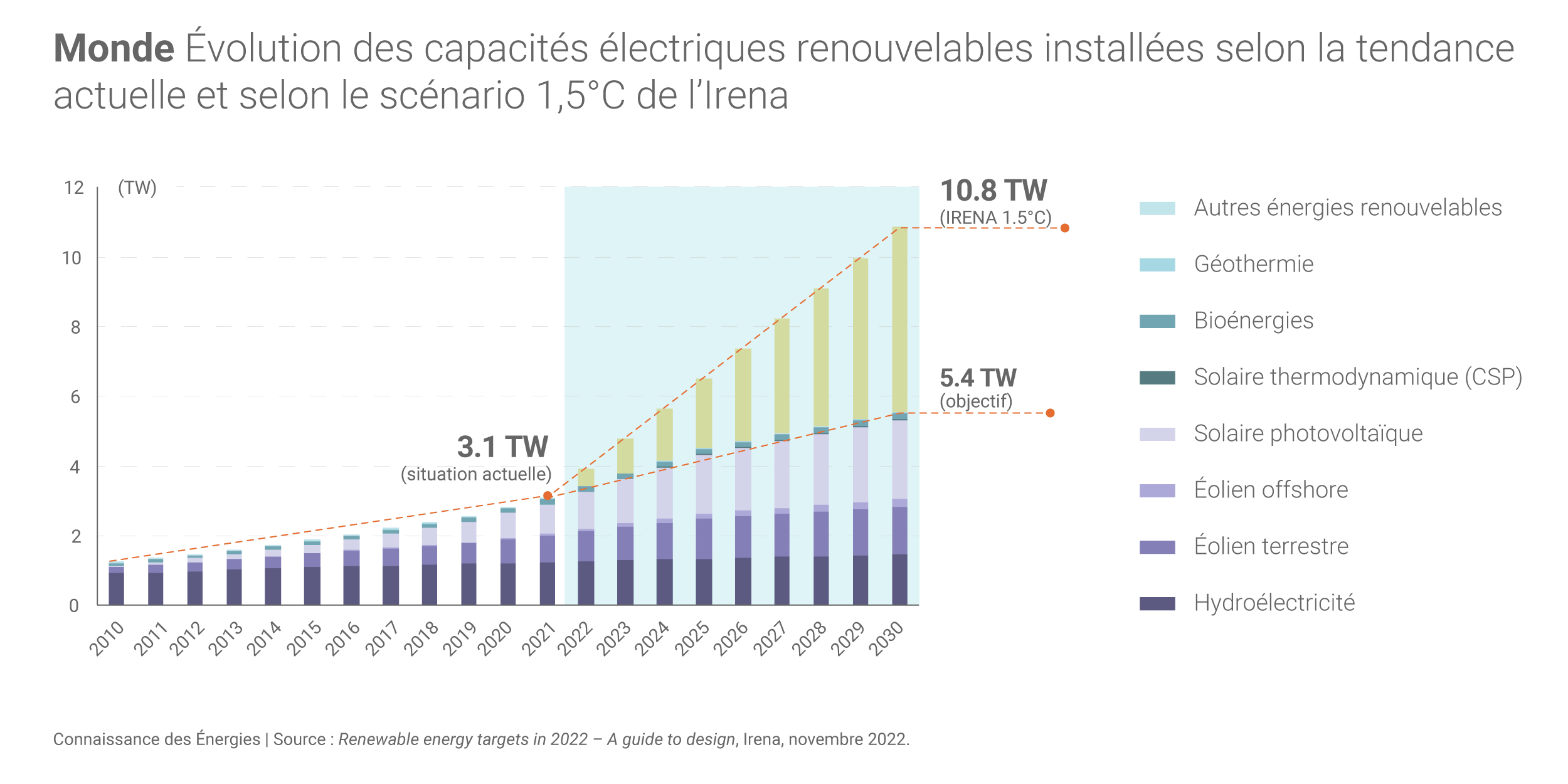 Dans son rapport « Renewable energy targets in 2022 : A guide to design », l'Irena expose 2 scénarios : l'un sur la base des politiques annoncées et un autre dit « Scénario 1,5°C » censé permettre de limiter à 1,5°C la hausse des températures mondiales (par rapport au niveau de l'ère préindustrielle).