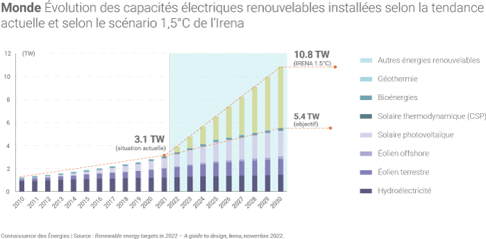 L'Irena entend ainsi montrer l'écart énorme entre ces deux trajectoire : par exemple « d'ici 2030, les pays visent à atteindre 5,4 TW de capacités renouvelables installées. Cela ne représenterait que la moitié des 10,8 TW de capacités renouvelables nécessaires dans le scénario 1,5 °C de l'Irena », indique l'Agence.