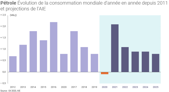 Selon les dernières données actualisées de l’AIE, la demande mondiale de pétrole entre 2019 et 2025 pourrait augmenter de 5,7 Mb/j (la Chine et l’Inde comptant pour la moitié de cette hausse). Les capacités de production devraient quant à elle augmenter plus fortement (+ 5,9 Mb/j entre 2019 et 2025)(6), créant un nouveau déséquilibre sur les marchés pétroliers(7).