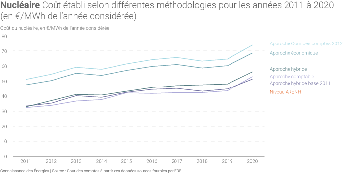 L’approche adoptée n’a rien d’anodin et elle peut aboutir à « des résultats très différents selon le rythme effectif des amortissements comptables ». Ainsi, pour évaluer le coût complet de production du parc nucléaire existant pour les années 2011 à 2020, la Cour des comptes a appliqué ces différentes méthodes et fait état d’un « coût oscillant autour de 42 €/MWh sur la période en retenant la méthode comptable » (prix retenu dans le cadre de l'Arenh depuis 2012) mais « de l’ordre de 60 €/MWh » avec l’approche économique(2).