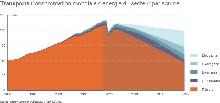 La consommation d’énergie liée aux transports pourrait en particulier avoir atteint un pic en 2019 selon DNV GL (voir graphique ci-dessous), qui envisage une électrification massive du secteur dans les prochaines décennies : dès 2032, la moitié des véhicules particuliers vendus dans le monde seront des modèles électriques dans son scénario. La consommation des bâtiments pourrait quant à elle continuer à augmenter d'ici à 2050 malgré les progrès en matière d’efficacité énergétique (hausse de 24% de la consommation du secteur par rapport au niveau de 2018), en raison entre autres d’une forte hausse des surfaces occupées et d’un triplement de la consommation mondiale d’énergie liée au « rafraîchissement » de ces espaces.