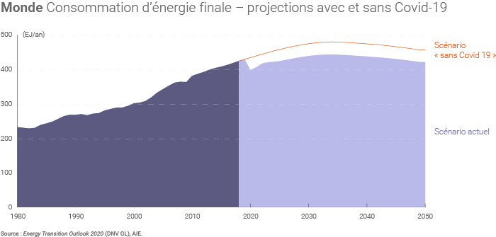 Par rapport à « ses prévisions réalisées avant la pandémie », DNV GL a réduit de 6 à 8% par an le niveau de la consommation énergétique mondiale dans son scénario d’ici à 2050 : la crise sanitaire et économique a « provoqué des changements majeurs, notamment une réduction du transport longue distance et une augmentation du télétravail », dont les effets continueront à se faire sentir d’ici la moitié du 21e siècle. La consommation mondiale d’énergie finale pourrait, d'après le groupe norvégien, atteindre un pic en 2034.
