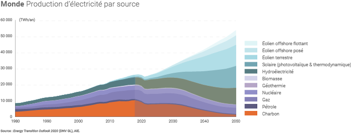 La structure du mix mondial de production d’électricité serait également bouleversée : grâce aux chutes de coûts et aux progrès en matière de stockage, DNV GL considère que les énergies renouvelables pourraient compter pour 78% du mix électrique mondial en 2050 (contre 26% en 2018), les filières à production intermittente – éolien et solaire photovoltaïque en tête(4) – atteignant alors à elles seules une part de 62% dans ce mix, contre 17% pour les énergies fossiles et 5% pour le nucléaire.