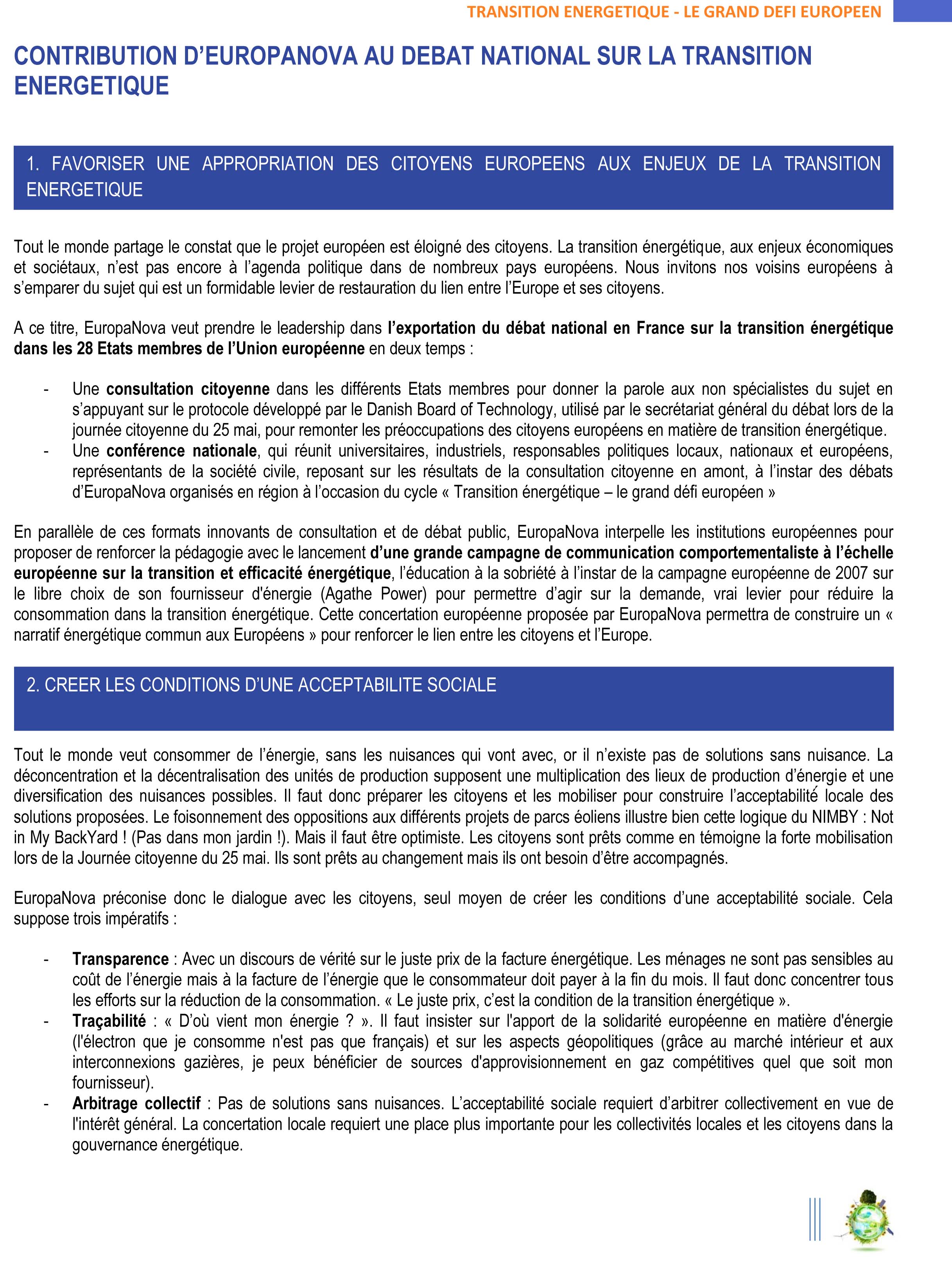 EuropaNova recommande notamment d’organiser, dans les 28 pays membres de l’UE, une consultation citoyenne sur le modèle de la journée citoyenne du 25 mai dernier en France suivie d’une conférence nationale afin de construire un « narratif énergétique commun aux Européens ». L’organisation indique d’autres axes afin de rendre le système énergétique européen plus performant : tenir un discours de vérité sur le juste prix de la facture d’énergie dont s’acquittent les consommateurs, renforcer les responsabilités des Régions, opérer un travail de fond sur l’acceptabilité sociale, organiser systématiquement un Sommet européen de l’énergie pour chaque présidence tournante de l’UE (tous les 6 mois), reformer structurellement le système européen d’échange de quotas de CO2, etc.