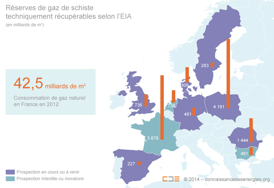 En France et à peu près partout en Europe, la technique de fracturation hydraulique pour récupérer du gaz de schiste a été interdite. Les quelques pays ayant autorisé les forages ont été déçus des quantités de gaz trouvées, ou ont préféré arrêter face aux différents risques. Il est toutefois probable que l'Europe dispose de ressources en gaz de schiste sous son sol, qu'elle préfère importer à prix fort, tant sur le plan économique que géopolitique.