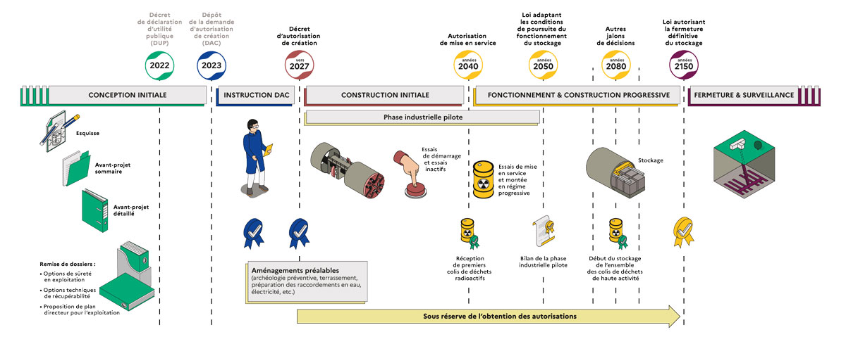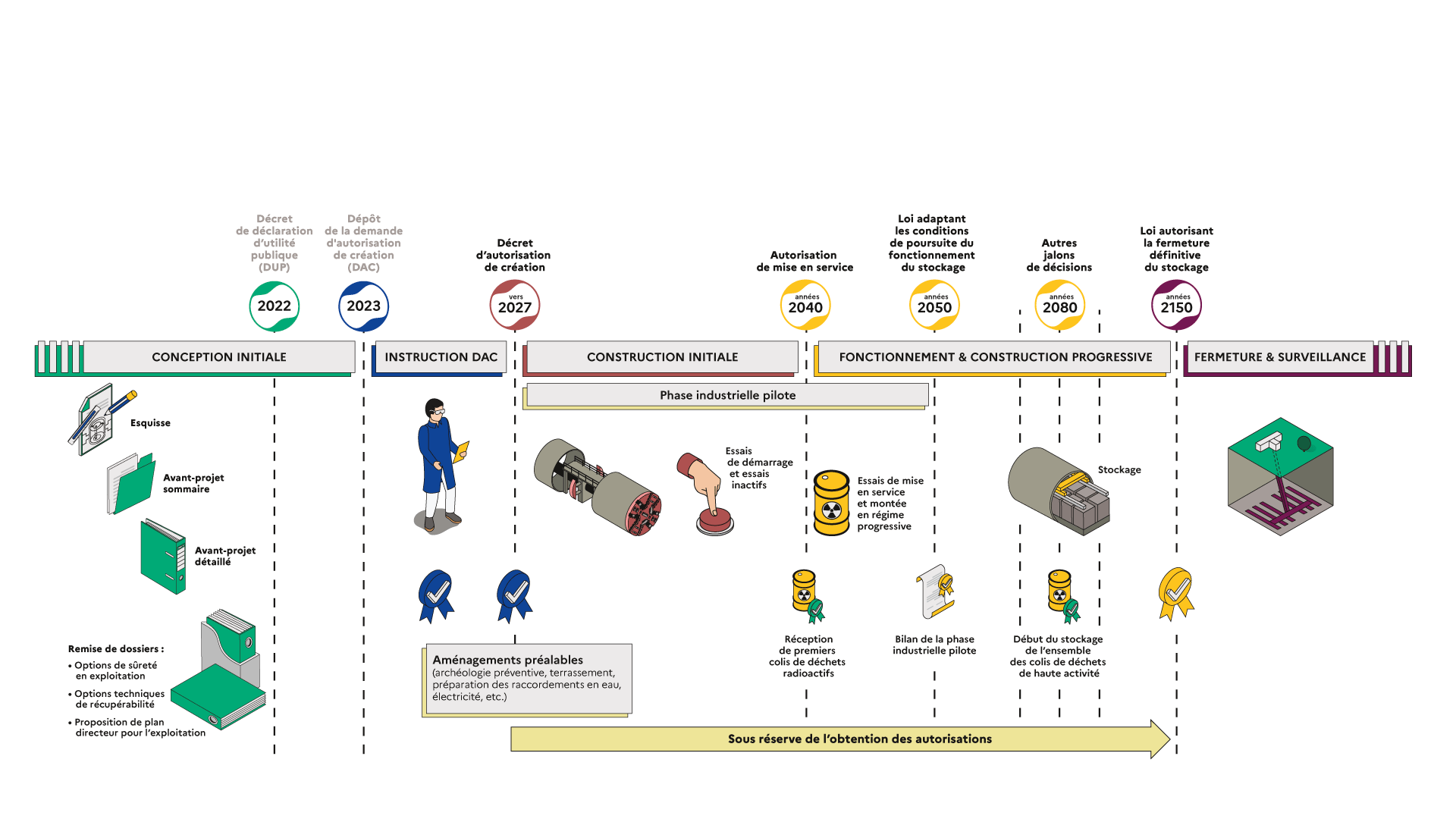 La SGDN envisage le début de la construction de son site de stockage vers 2033, en vue d'un début d'exploitation au début des années 2040.