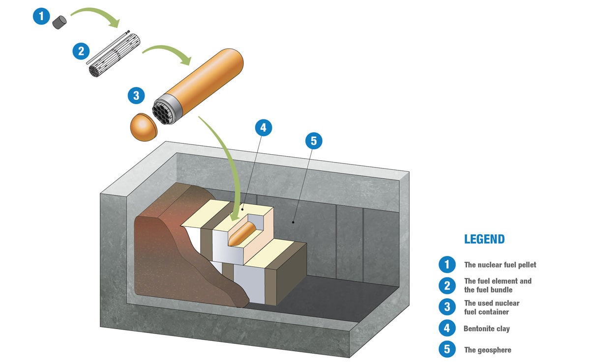 Le projet canadien va stocker l'intégralité des assemblages de combustibles nucléaires usés provenant du parc nucléaire national. En France, tous les combustibles usés sont retraités à l'usine d'Orano de La Hague.