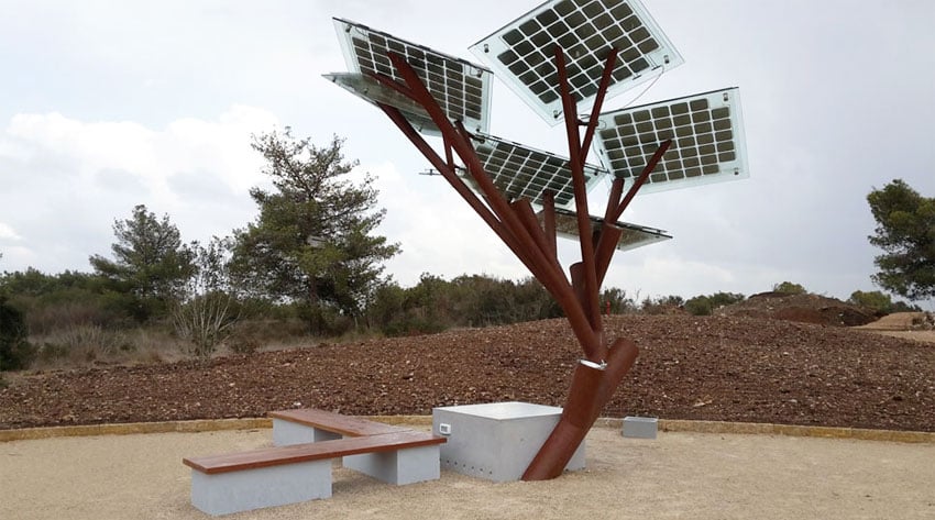 Conçue par la société israélienne Sologic, l’eTree est une structure de 4,5 m de haut pesant près de 1 250 kg. Il est équipé de 7 panneaux photovoltaïques assimilables à de grandes feuilles. La puissance totale de cet arbre électrique est de 1,4 kW (avec une production annuelle évaluée à 2 400 kWh).