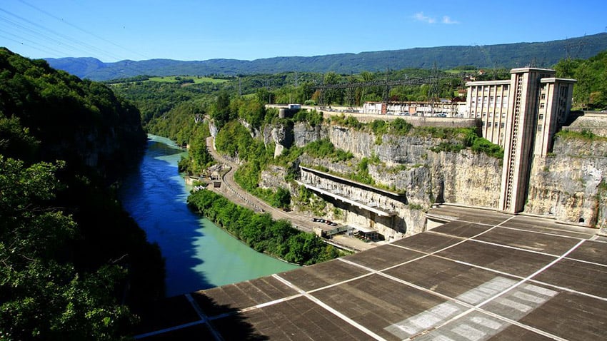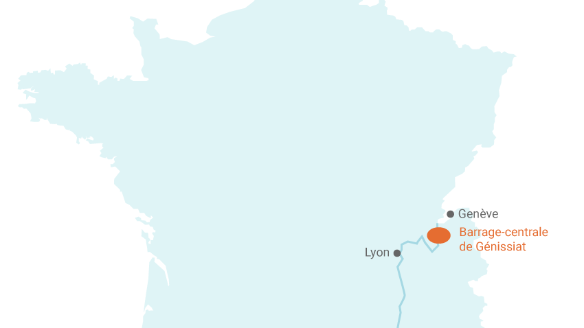 La centrale hydroélectrique de Génissiat produit environ 1,7 TWh par an selon CNR. Les hydroliennes seront installées en aval de ce barrage. (©Camille Moirenc/photothèque CNR)