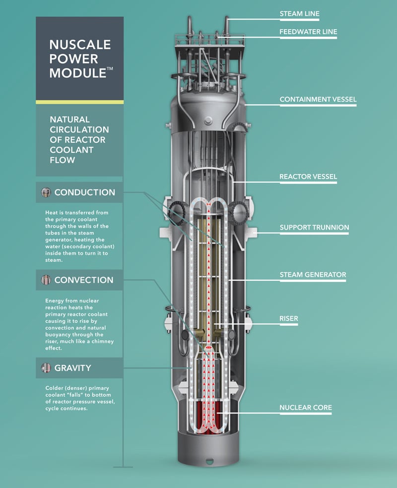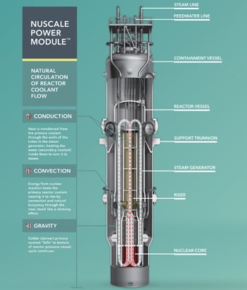 Concrètement, la réaction nucléaire s’effectue au sein d’un module cylindrique de près de 23 m de haut et de 4,5 m de diamètre(1). Le « cœur nucléaire », disposé à la base du cylindre imaginé par NuScale, chauffe de l’eau sous pression qui s’élève par convection naturelle (sans pompe primaire) et se refroidit en cédant sa chaleur à un fluide secondaire au sein d’un générateur de vapeur (la vapeur produite est ensuite turbinée).