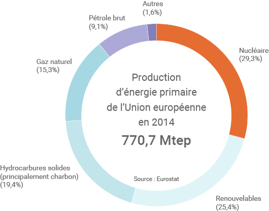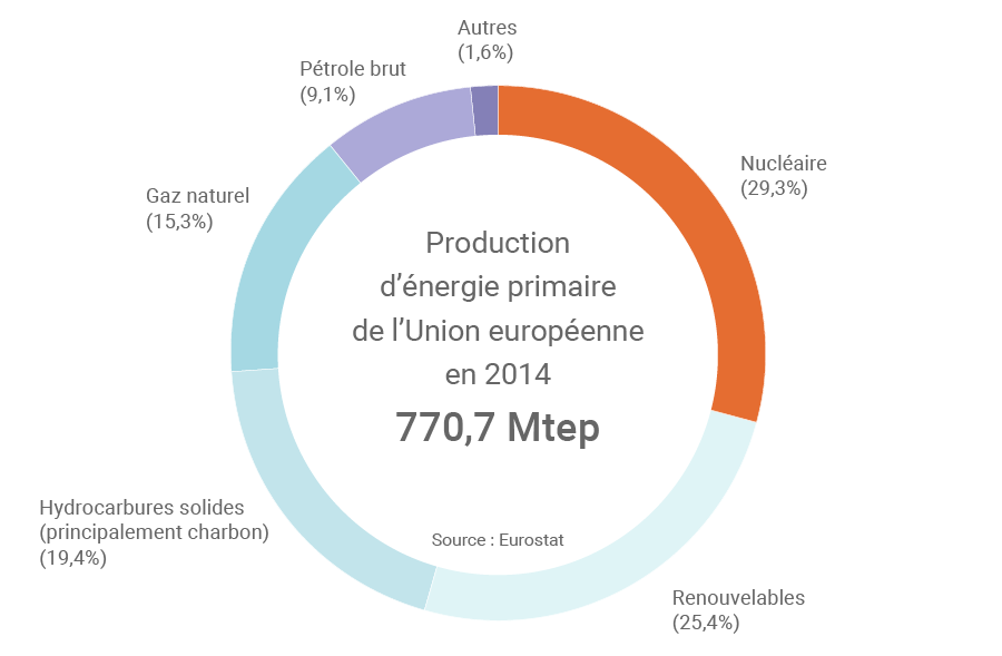 Les produits pétroliers et le gaz naturel comptent respectivement pour près de 40% et 22% de la consommation d’énergie finale de l’Union européenne en 2014. Or une grande majorité de ces hydrocarbures sont importés, la Russie et la Norvège étant les deux principaux fournisseurs des États membres. Au sein de l’Union européenne, Eurostat indique que la production d’énergie primaire repose principalement sur... le nucléaire et les énergies renouvelables, avec là encore de fortes disparités entre les 28 États membres.