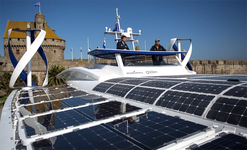 Le catamaran de 35 m de long est reparti le 9 avril de Lorient(3) pour un voyage de 5 ans (« Odissey 2017-2021 ») durant lequel seront mises en valeur les différentes sources d’énergie exploitées à son bord : les 500 m2 de panneaux photovoltaïques (puissance de 100 kWc) installés sur son pont supérieur et sur ses deux ailes amovibles doivent permettre de produire jusqu’à 750 kWh d’électricité par jour lors de « très belles journées ensoleillées ». Cette électricité servira à alimenter directement le moteur du navire (avec une vitesse moyenne de l’ordre de 5 nœuds), à recharger des batteries embarquées (pouvant stocker 754 kWh) mais aussi à produire de l’hydrogène par électrolyse de l’eau, tout comme Energy Observer.