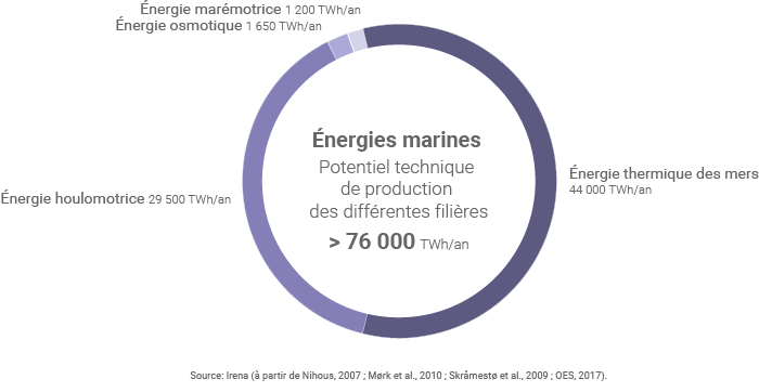 L'Irena indique que l'énergie thermique des mers présente le plus grand potentiel parmi les énergies marines tandis que l'énergie marémotrice (filière la plus mature avec notamment une centrale en activité en France à La Rance depuis 1966) présente un potentiel bien plus réduit, compte tenu des conditions géographiques nécessaires à son exploitation (seule « une petite douzaine de pays pourrait l'exploiter » selon l'Irena).