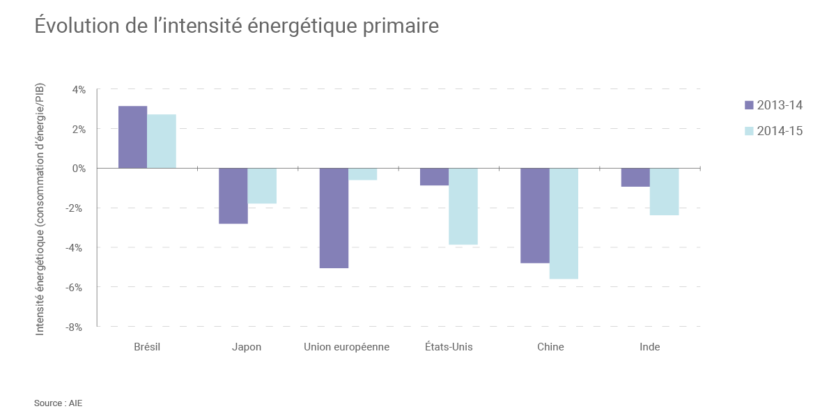 Si cette baisse de l’intensité énergétique est saluée par l’AIE, en particulier en 2015 dans un contexte de prix bas du pétrole n’incitant pas aux économies d’énergie, elle est encore trop lente selon l'Agence pour « mettre le monde sur les rails d’un système énergétique décarboné ». Selon l’AIE, l’intensité énergétique mondiale devrait baisser d’au moins 2,6% par an entre 2016 et 2030 pour se situer sur une trajectoire compatible avec les objectifs climatiques de la COP21.