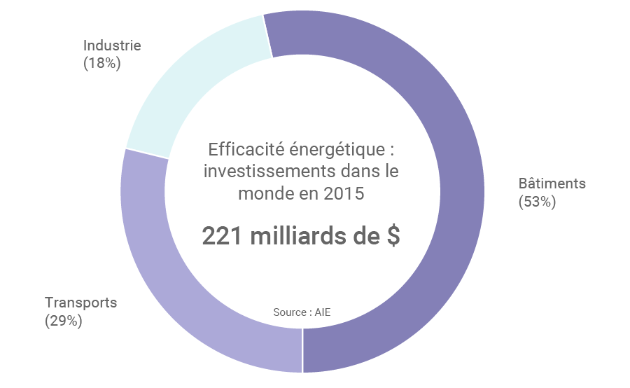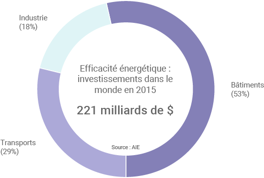 Les investissements mondiaux en matière d’efficacité énergétique en 2015 sont estimés par l’AIE à 221 milliards de dollars, ce qui constitue une hausse de 6% par rapport à 2014. Plus de la moitié de ces investissements ont été consacrés à l’amélioration de l’efficacité énergétique dans les bâtiments (en incluant l’éclairage(4) et l’électroménager y étant installé).