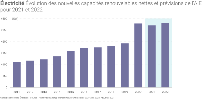 En 2020, les installations mondiales de nouvelles capacités électriques renouvelables ont atteint leur plus haut niveau depuis plus de deux décennies. L’Agence internationale de l’énergie (AIE) estime, dans un rapport publié le 11 mai(1), que le rythme de développement de ces filières devrait se maintenir à un niveau similaire en 2021 et 2022.