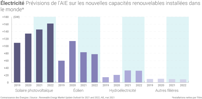 L’AIE se montre notamment optimiste sur le développement des filières renouvelables productrices d’électricité en raison de la forte baisse des coûts des projets retenus dans le cadre d’enchères en 2020 : « l’Inde et la Chine ont mis aux enchères presque 55 GW de capacités éoliennes et solaires (en 2020) avec des prix moyens des contrats de 60 $/MWh pour l’éolien et de 47 $/MWh pour le photovoltaïque ».