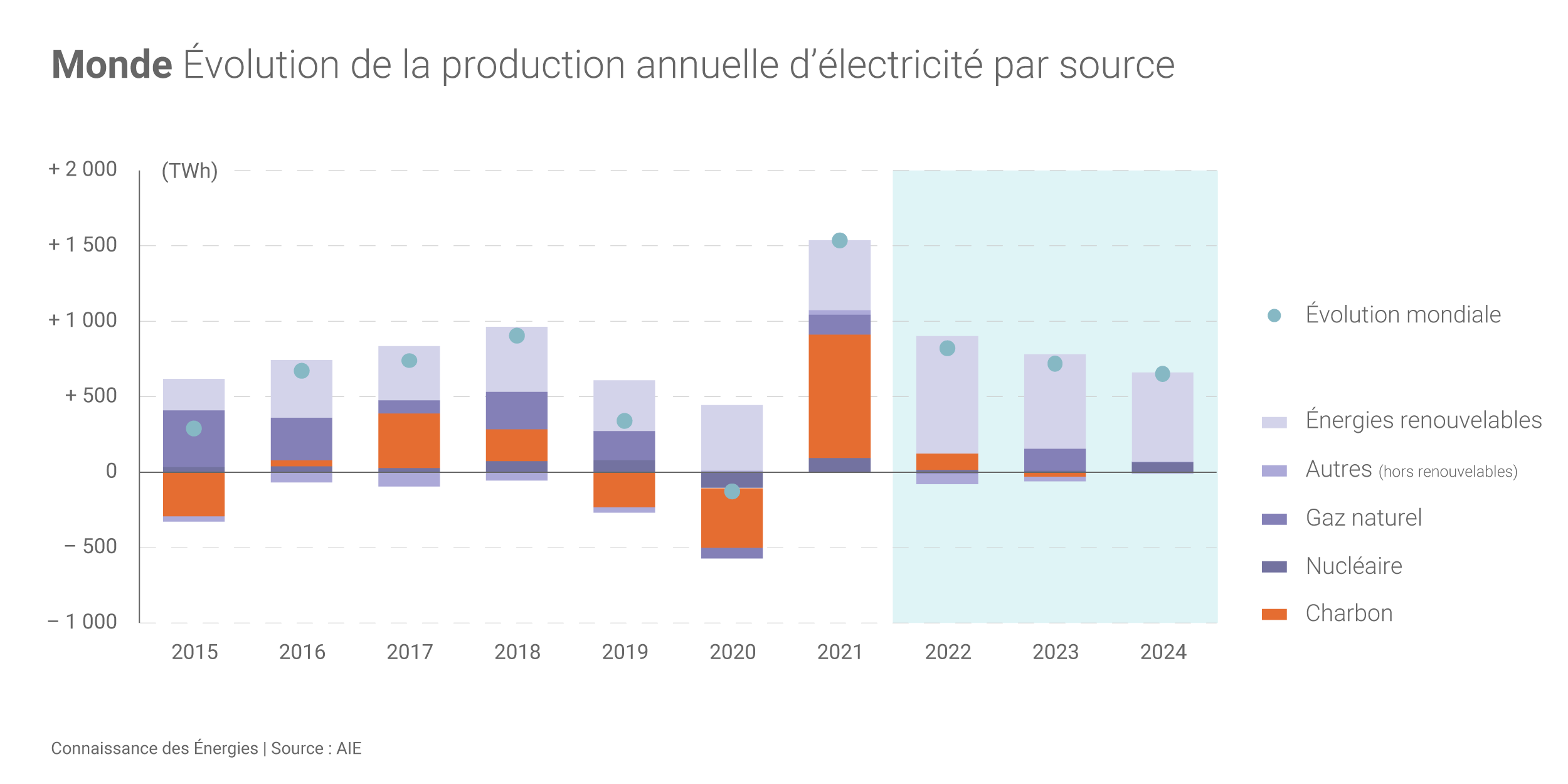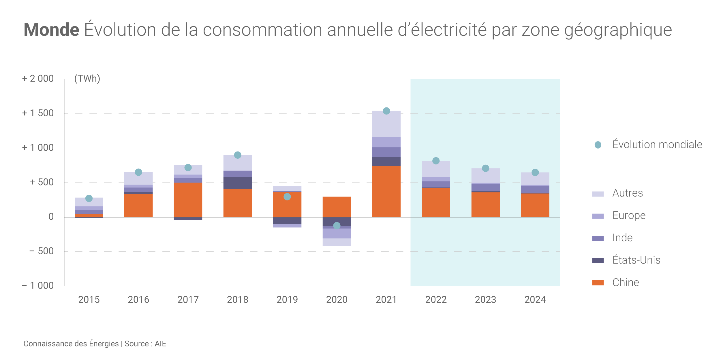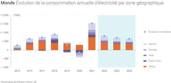 Les niveaux records de consommation de charbon ont été dépassés presque chaque année depuis dix ans. Après avoir faiblement chuté en 2020, la consommation mondiale d’électricité a augmenté de plus de 1 500 TWh en 2021, soit « la plus forte hausse annuelle jamais enregistrée en termes absolus » selon les dernières données de l’AIE. Elle a au total augmenté de 6% par rapport à 2020. Il s’agissait de la plus forte hausse annuelle en pourcentage depuis 2010 après la crise financière. Et la hausse s'est poursuivie depuis.