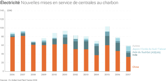 Pire, en l'absence de nouveaux engagements, « les fermetures de centrales à charbon dans le monde seront quasiment compensées par de nouvelles mises en service d'ici à 2025 », alerte l'AIE. Plus de 200 GW de centrales à charbon sont en cours de construction, principalement en Chine, en Inde et en Asie du Sud.