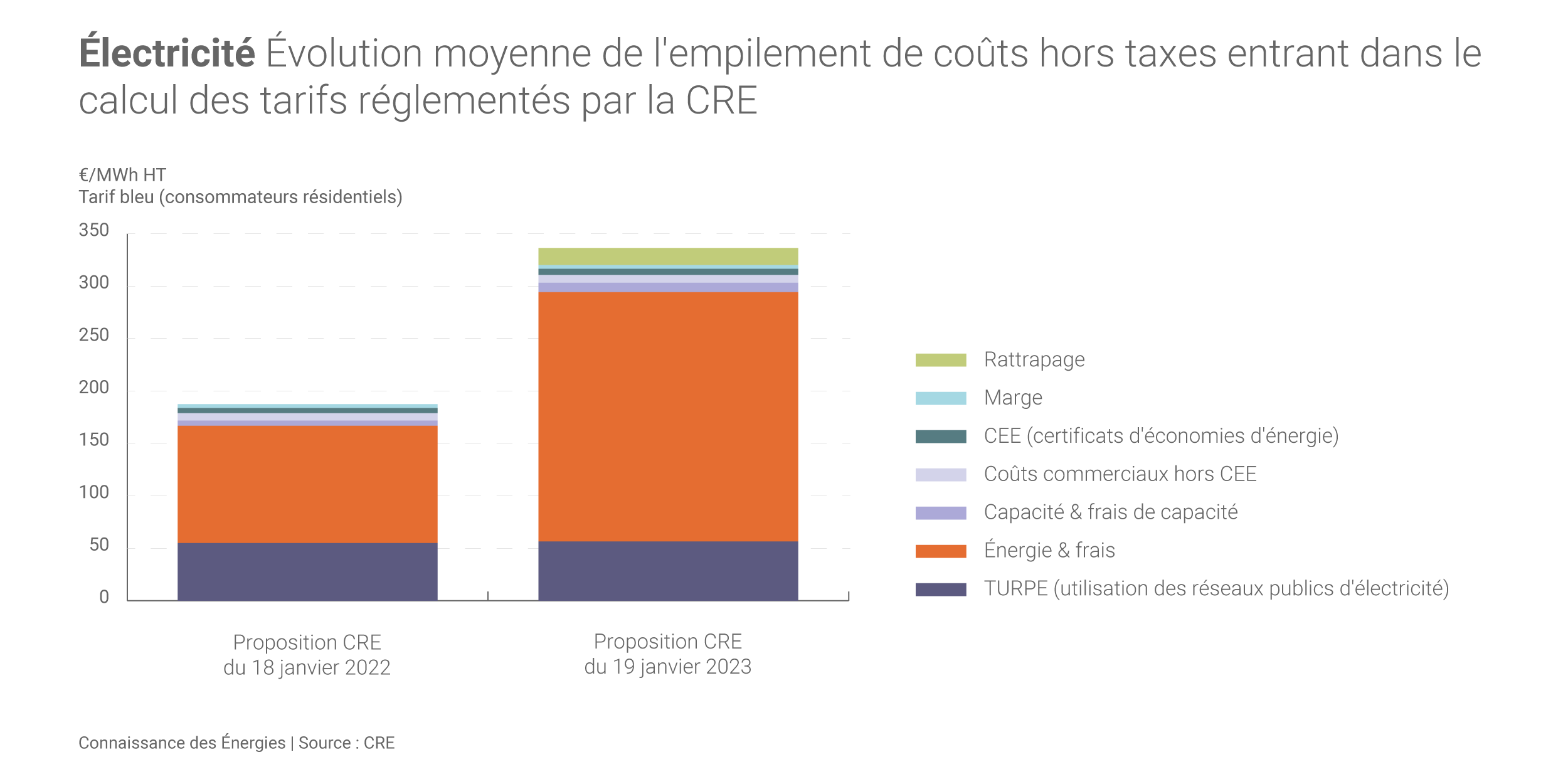 Pour rappel, les propositions de la CRE concernant les tarifs réglementés intègrent en particulier « l’évolution des coûts de l’approvisionnement en énergie et en capacité au marché, [...] de l’ARENH, d’acheminement, des coûts de commercialisation et d’approvisionnement en certificat d’économie d’énergie, de la rémunération normale [...] et du rattrapage du gel tarifaire de 2022 sur un an ».