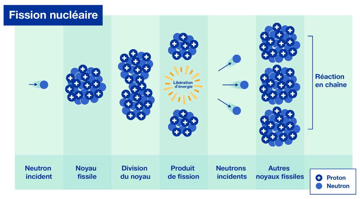 Notons que l’atome lourd est appelé noyau « fissile » car il subit le processus de fission nucléaire (l’uranium 235 utilisé dans les réacteurs nucléaires est le seul noyau fissile naturel existant).