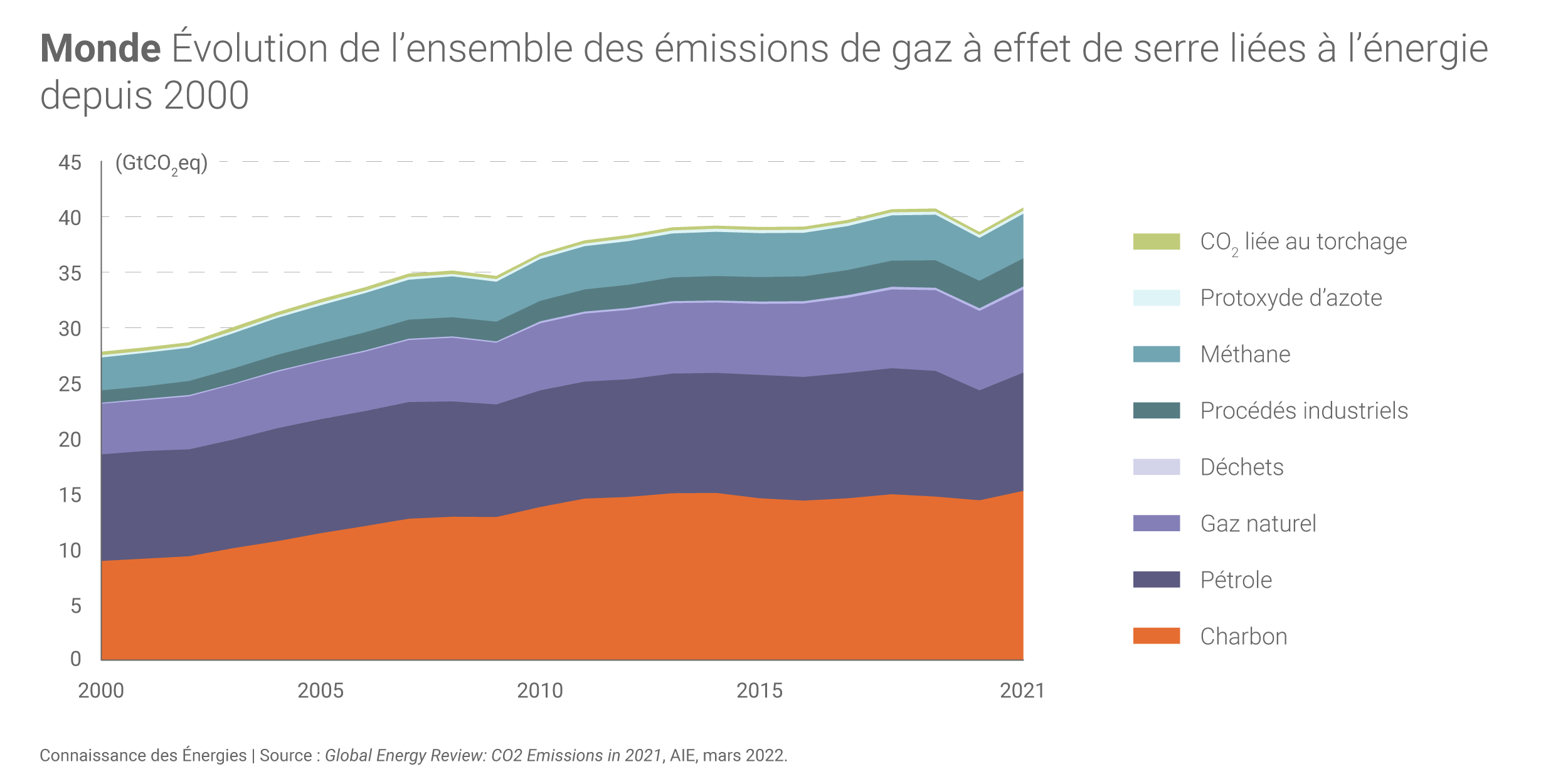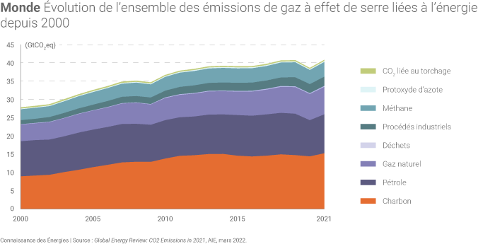 Les émissions mondiales de CO2 liées à l’énergie se sont élevées à 36,3 milliards de tonnes (Gt) selon l’AIE. C’est 6% de plus qu’en 2020 (avec une hausse annuelle de plus de 2 Gt desdites émissions, un record) - année perturbée par la pandémie de Covid19 - mais également le plus haut niveau annuel jamais mesuré.