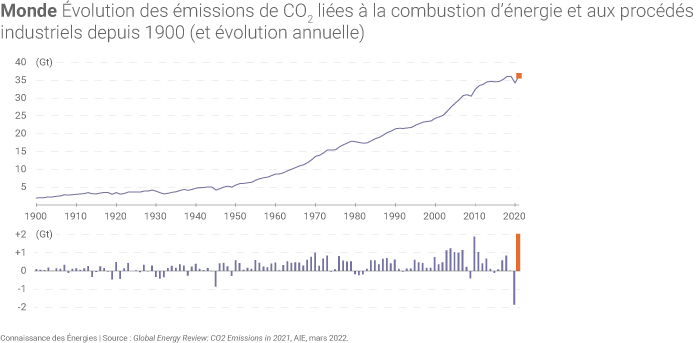 Les émissions mondiales de CO2 liées à l’énergie se sont élevées à 36,3 milliards de tonnes (Gt) selon l’AIE. C’est 6% de plus qu’en 2020 (avec une hausse annuelle de plus de 2 Gt desdites émissions, un record) - année perturbée par la pandémie de Covid19 - mais également le plus haut niveau annuel jamais mesuré.