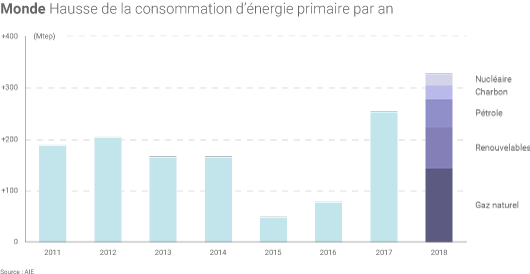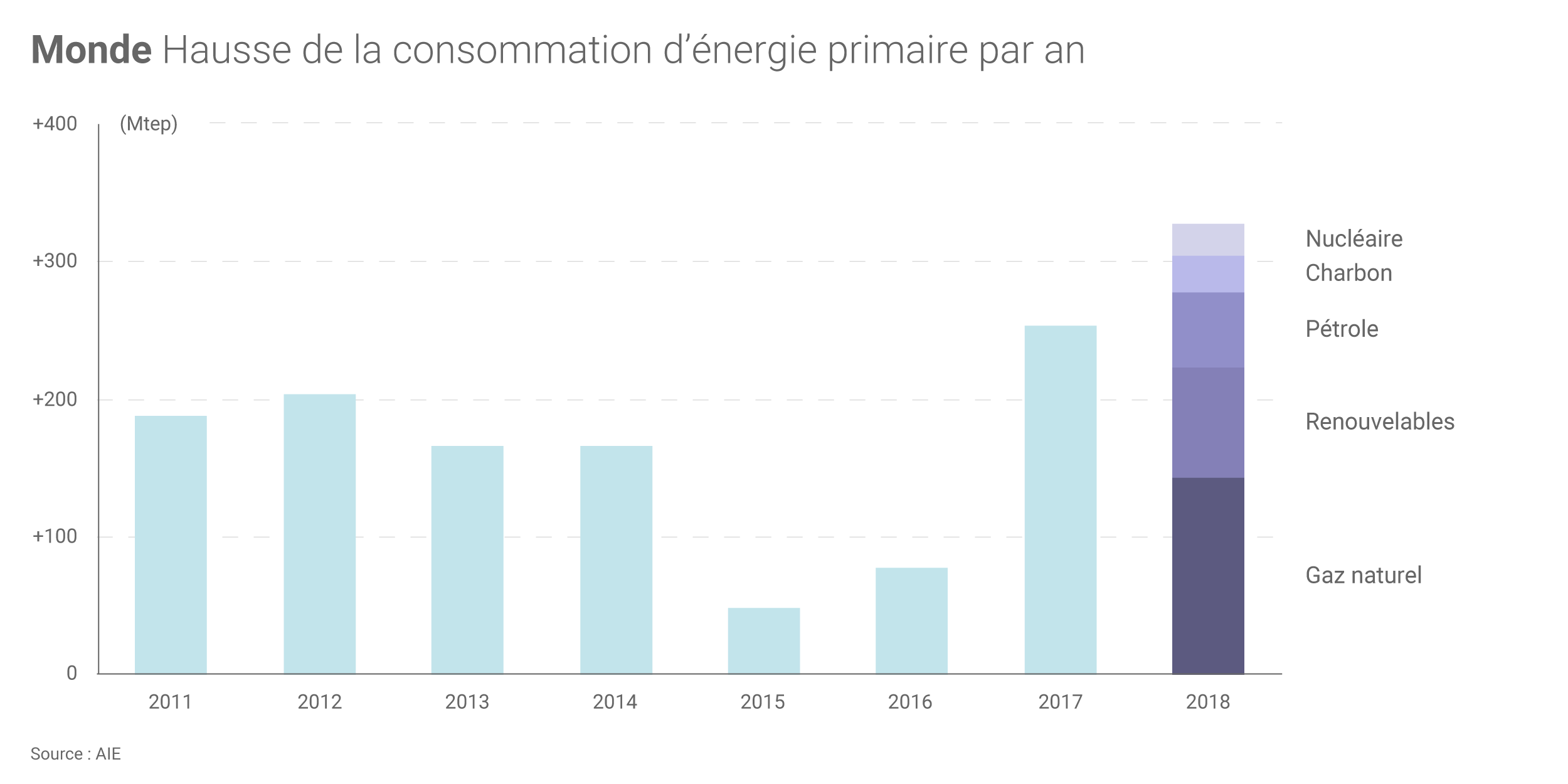 En 2018, la consommation mondiale d’énergie primaire a encore reposé à 80% sur les énergies fossiles selon l’AIE. Le monde a consommé l’an dernier 4,6% de gaz en plus, 1,3% de pétrole en plus et 0,7% de charbon en plus qu’en 2017. Près de 45% de la hausse de consommation mondiale d’énergie de 2018 a été satisfaite par le seul gaz naturel, le directeur exécutif de l'AIE Fatih Birol qualifiant l'an dernier de nouvelle « année dorée » pour ce combustible. L’AIE souligne que la consommation américaine de gaz a en particulier augmenté de 10% l’an dernier (cette hausse équivaut à la consommation annuelle de gaz du Royaume-Uni).
