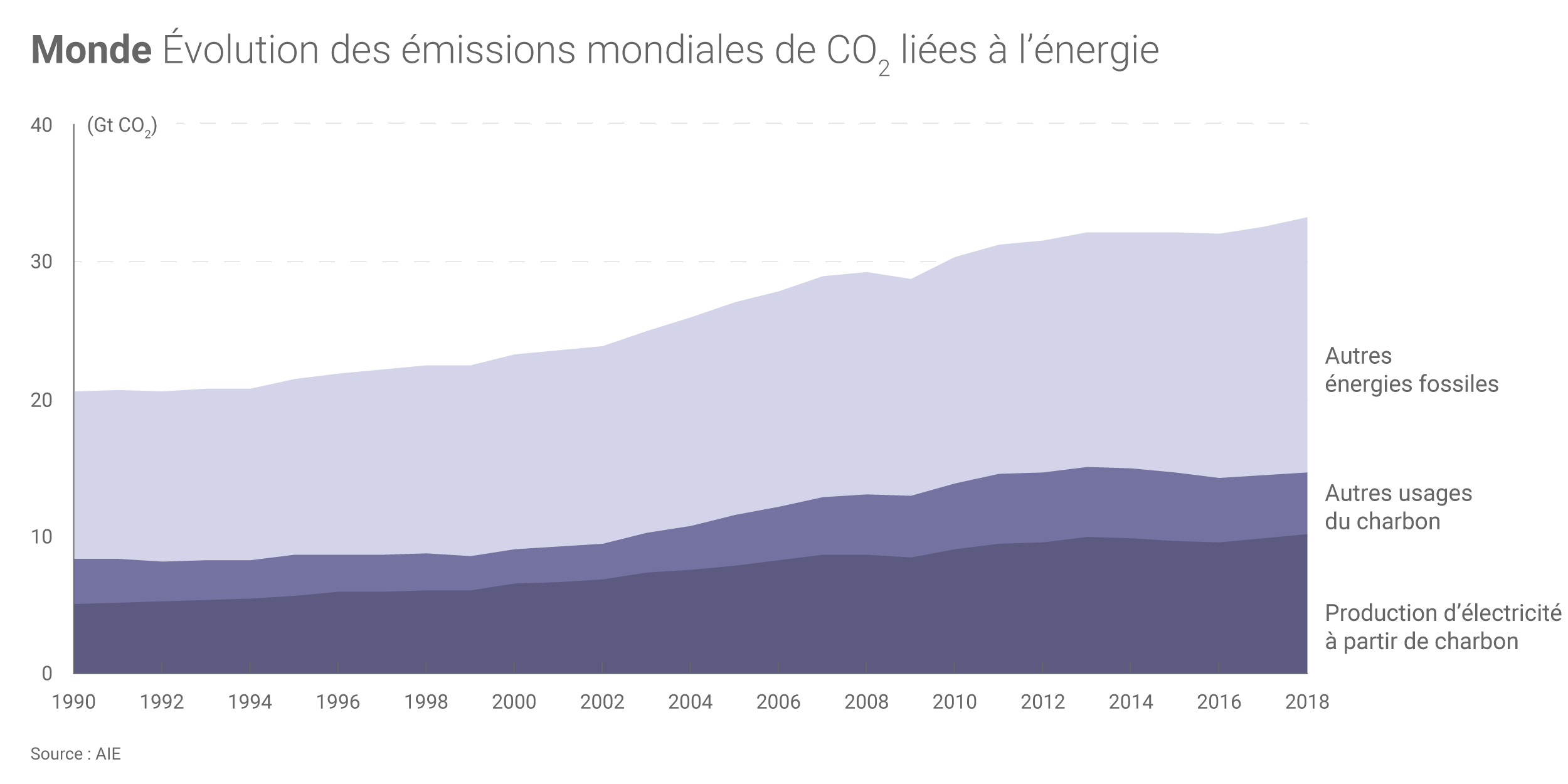 En 2018, les émissions de CO2 liées à l’énergie ont atteint 33,1 milliards de tonnes (Gt) selon l’AIE, soit une hausse de 1,7% par rapport à 2017. Il s’agit de la plus importante hausse annuelle depuis 2013, les 565 millions de tonnes (Mt) supplémentaires de CO2 émises l’an dernier équivalant approximativement aux émissions annuelles de CO2 de l’aviation internationale.