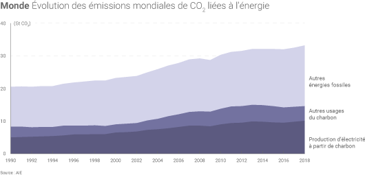 Les centrales à charbon productrices d’électricité seraient à elles seules responsables d’environ 30% des émissions mondiales de CO2 liées à l’énergie (10,1 Gt CO2 en 2018). En Asie, où le charbon suscite un fort intérêt, les centrales utilisant ce combustible sont exploitées depuis seulement 12 ans en moyenne, souligne l’AIE, « soit des décennies de moins que leur durée de vie économique moyenne d'environ 40 ans ».