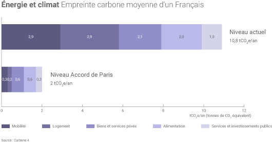 Il est rappelé que l’empreinte carbone moyenne d’un Français (empreinte carbone de la France divisée par le nombre d’habitants) est de 10,8 tonnes de CO2 équivalent par an (donnée pour 2017). Les émissions de gaz à effet de serre liées à la mobilité et aux activités dans les logements comptent pour plus de la moitié de cette empreinte. Cette dernière devrait être réduite d’environ 80% d’ici à 2050 pour « parvenir aux 2 tonnes de CO2 compatibles avec l’Accord de Paris », estime Carbone 4.