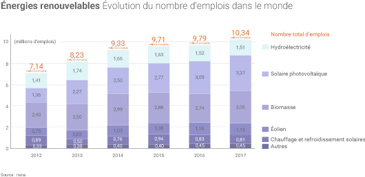 En 2017, plus de 10,3 millions de personnes dans le monde travaillaient(2) dans le secteur des énergies renouvelables, soit plus d’un demi-million en plus qu’en 2016 (+ 5,3%) selon les dernières estimations de l’Irena. Près de 32,5% de ces emplois étaient liés au solaire photovoltaïque (3,37 millions, soit + 8,7%), ce qui en fait la principale filière renouvelable sur ce critère, devant la biomasse (incluant les biocarburants, 3,06 millions et + 11,7%) et l’hydroélectricité (1,54 million, niveau quasiment stable).