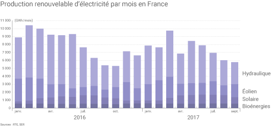 Entre début octobre 2016 et fin septembre 2017, ces dernières ont produit 86,3 TWh en France, couvrant près de 17,9% de la consommation électrique nationale selon les dernières données du gestionnaire de réseau RTE(1). Dans le détail, c’est l’hydroélectricité qui constitue encore de loin la principale filière renouvelable productrice d’électricité en France (48,6 TWh, soit près de 56% de la production renouvelable sur la période considérée)(2).
