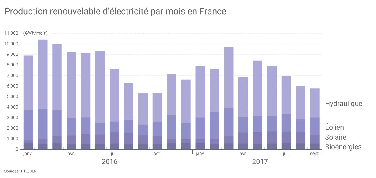 La production électrique renouvelable en France repose encore majoritairement sur le parc hydroélectrique (©Connaissance des Énergies, d'après RTE)