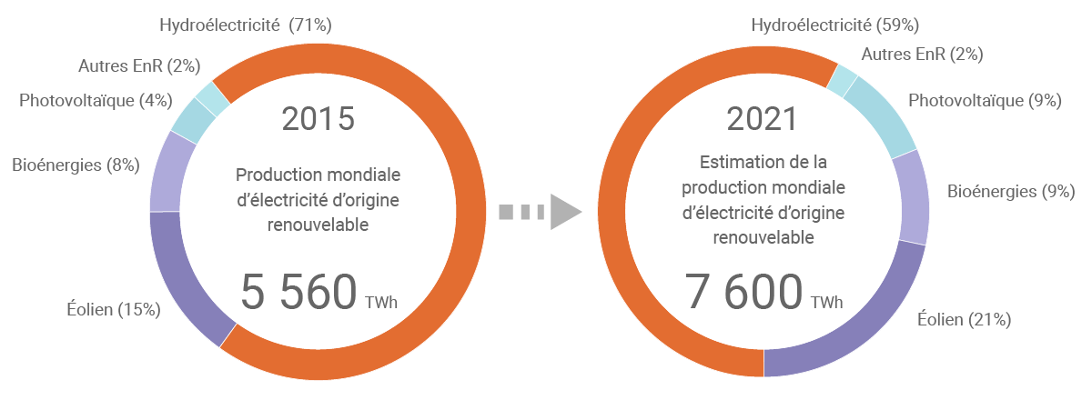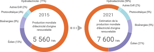 La production mondiale d’électricité d’origine renouvelable s'est élevée à 5 560 TWh en 2015, soit à près de 23% de la production électrique totale cette année-là. (©Connaissance des Énergies, d’après AIE)