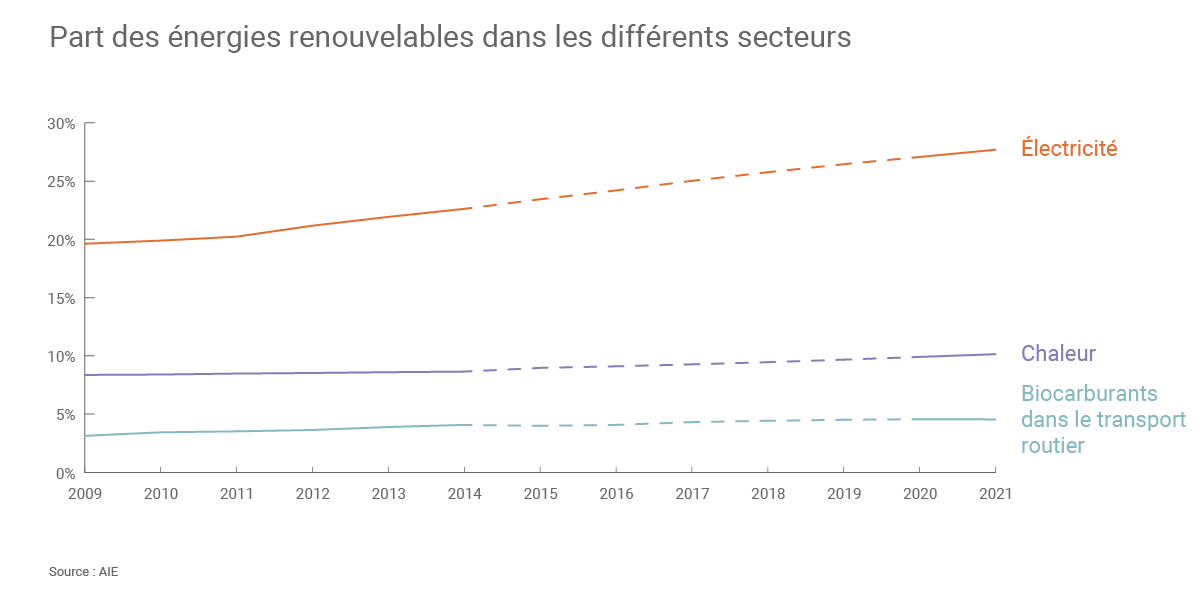 Évolution des énergies renouvelables dans différents secteurs (©Connaissance des Énergies, d’après AIE)