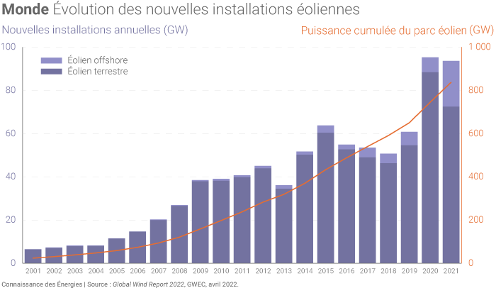 En 2021, la filière éolienne a connu, en matière de nouvelles installations, « la 2e meilleure année de son histoire » au niveau mondial (après 2020) : 93,6 GW de nouvelles capacités éoliennes ont été déployées, portant la puissance du parc mondial en fin d’année à 837 GW (soit 12% de plus qu’à fin 2020)(2).