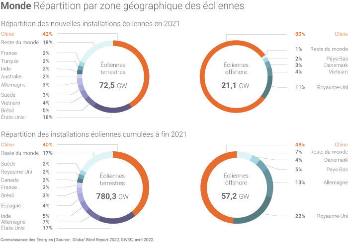 Malgré le ralentissement des installations d'éoliennes terrestres en Chine en 2021, ce pays reste de loin la principale zone de développement de la filière : en 2021, l'empire du Milieu a à lui seul compté pour 42% des installations d'éoliennes terrestres et 80% des installations d'éoliennes offshore au niveau mondial.
