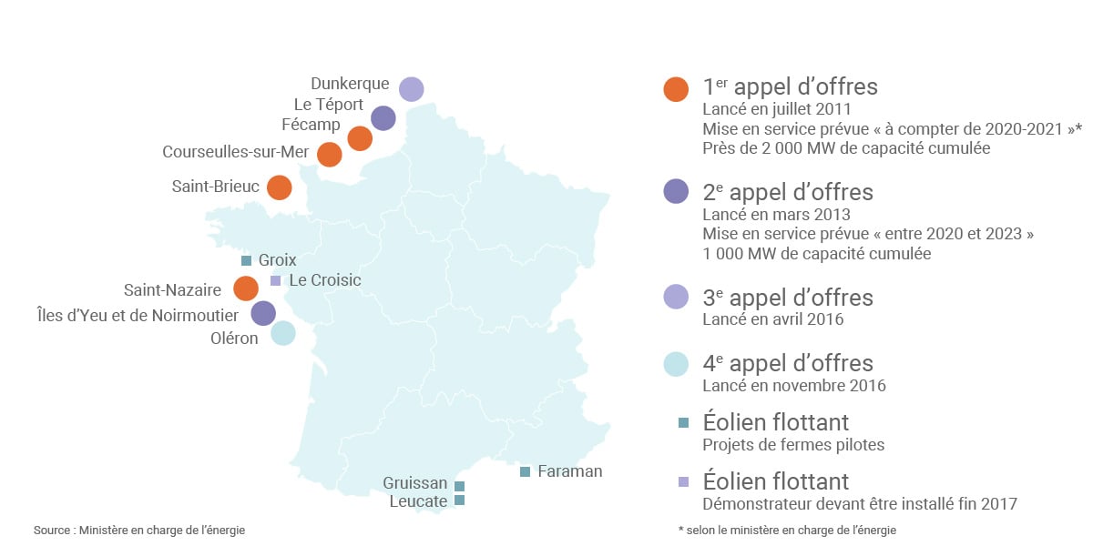 La Programmation pluriannuelle de l’énergie (PPE) publiée en octobre 2016 pose pour objectif de disposer d’un parc de 3 000 MW d’éolien offshore « posé » en France à fin 2023, date à laquelle entre 500 MW et 6 000 MW de projets supplémentaires devront par ailleurs avoir été « attribués, en fonction des concertations sur les zones propices, du retour d’expérience de la mise en œuvre des premiers projets et sous condition de prix ». L’objectif de 3 GW installés à fin 2023 implique que tous les parcs éoliens en mer retenus dans le cadre des 2 premiers appels d’offres soient en service à cet horizon.